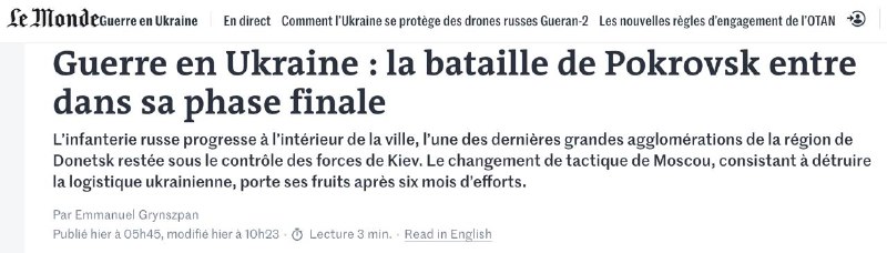 Ситуации в Покровске посвятило материал еще одно западное издание Le Monde. В интервью газете украинский офицер мотострелковой бригады, находящейся в городе более года, заявил, что падение Покровска - вопрос "дней, максимум двух недель".