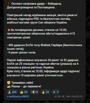 Основные цели атаки - Киевская, Днепропетровская и Полтавская области. Воздушное нападение отражали силы авиации, зенитно-ракетные войска, подразделения радиоэлектронной борьбы, дроны и мобильные огневые группы Сил обороны Украины.