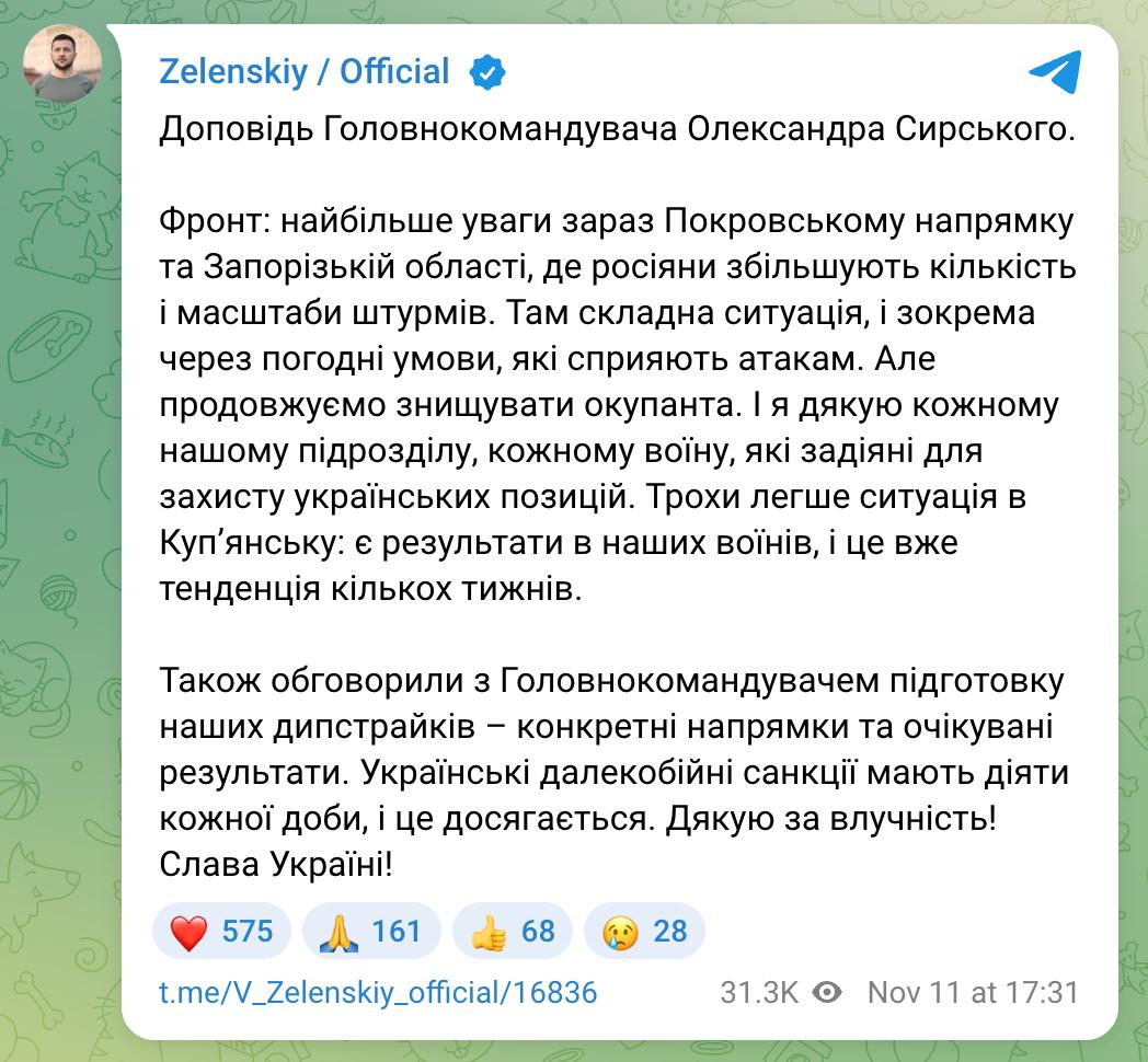 - в Покровске и Запорожской области "сложная ситуация", в частности, из-за погодных условий, которые способствуют атакам россиян (судя по видео с фронта, там сейчас сильный туман, что препятствует ударам дронов - Ред.) Россияне увеличивают количество и масштабы штурмов;