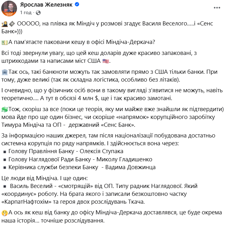Железняк пишет, что "Сенс Банк" (бывший "Альфа-банк") стал еще одной коррупционной схемой Миндича и Офиса президента.