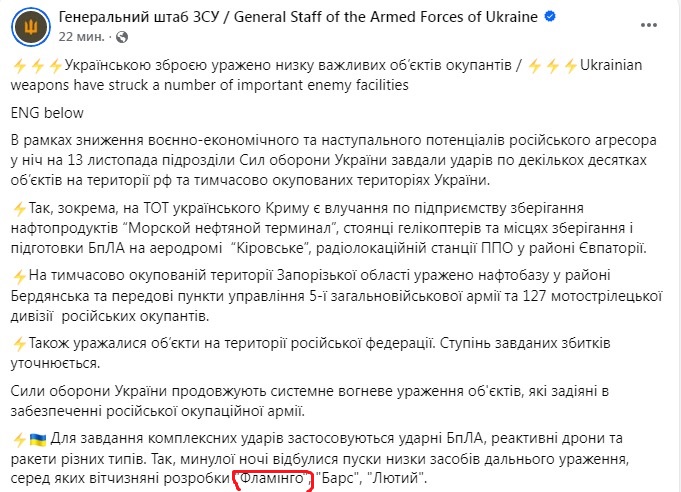 А сегодня Генштаб в своих соцсетях рассказал об ударах по десяткам объектов на территории РФ и оккупированных территориях Украины ракетами "Фламинго", дронами "Лютый" и гибридом ракеты и дрона "Барс".