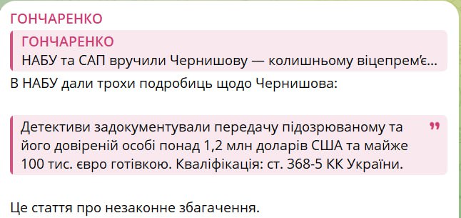 Детективы Национального антикоррупционного бюро Украины задокументировали передачу вице-премьеру Алексею Чернышову и его доверенному лицу более 1,2 млн долларов и почти 100 тысяч евро наличными.