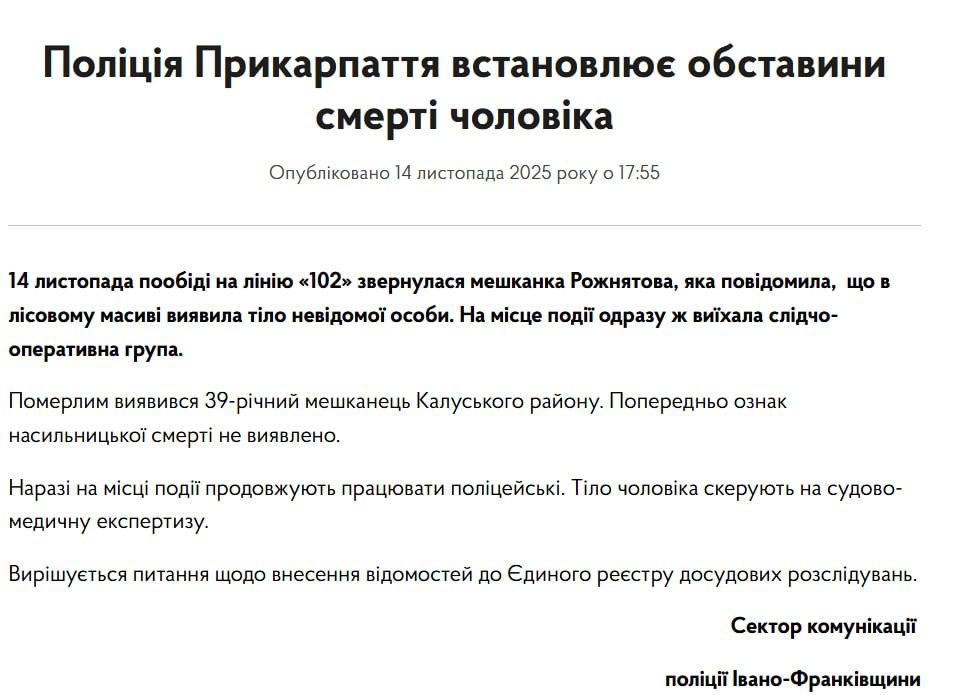 В лесу под Ивано-Франковском нашли тело мужчины, который накануне был мобилизован. Труп был найден в районе Рожнятова под Калушем.