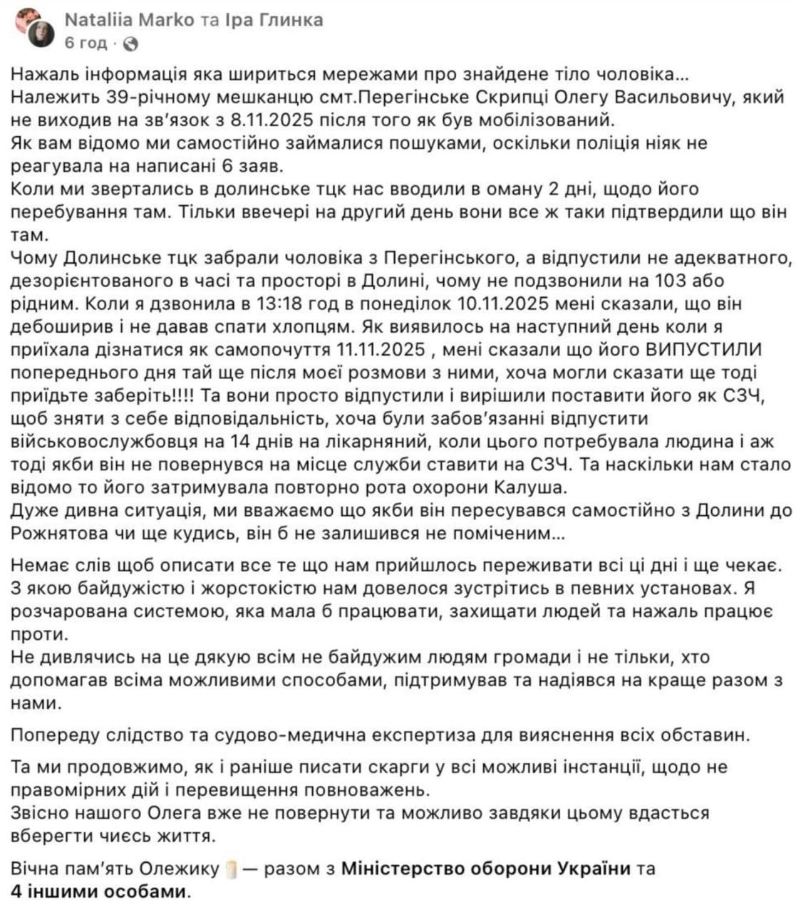 Знакомая Наталья Марко в свою очередь пишет, что тело принадлежит недавно мобилизованному Олегу Скрипце, которого забрали в ТЦК еще 8 ноября, после чего мужчина не выходил на связь.
