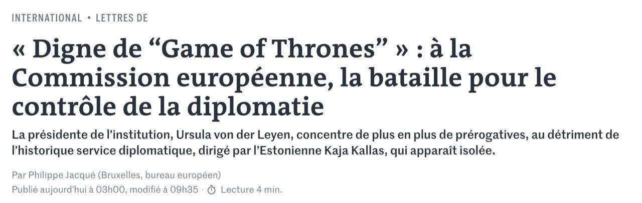 Газета сообщает о "почти навязчивом стремлении руководства Еврокомиссии сосредоточить всю власть в своих руках и не допустить появления любого конкурирующего, даже мало-мальски автономного субъекта". Брюссель дублирует все службы, уже существующие в Европейской службе внешних связей, поскольку последняя "становится всё более неэффективной".