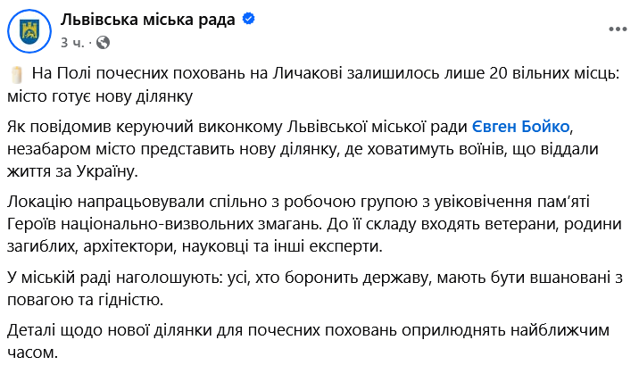 На Поле почётных захоронений на Лычаковском кладбище во Львове, где хоронят погибших украинских военных, осталось всего 20 свободных мест.