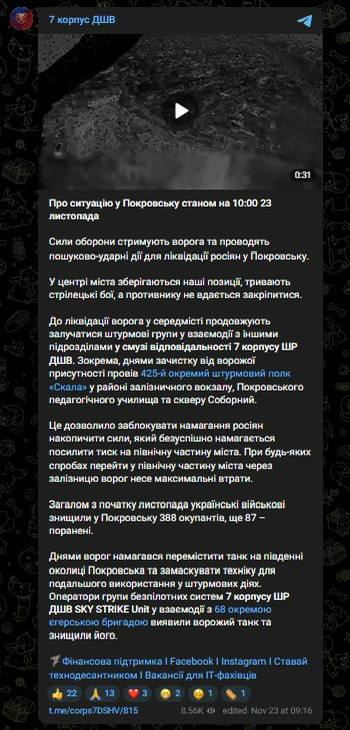 Напомним, что недавно некоторые украинские военные заявляли о полной потере Покровска.