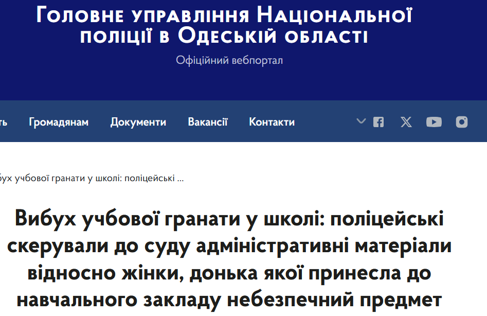 В Одесской области в лицее взорвалась учебная граната, которую принесла девятилетняя ученица.
