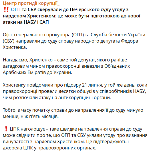 "Христенко сообщили о подозрении 21 июля, в тот же день, когда правоохранители провели десятки обысков у сотрудников НАБУ, чем начали атаку на антикоррупционные органы. То есть со времени начала дела до направления его в суд прошло менее пяти месяцев. Такое быстрое направление дела в суд может свидетельствовать о том, что ОГП и СБУ заключили соглашение о признании виновности Христенко. Это подтверждают и источники ЦПК в правоохранительных органах", – говорится в сообщении Центра противодействия коррупции.