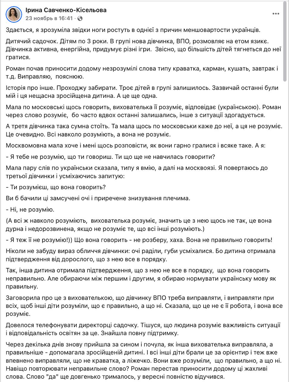 Преподаватель пожаловалась в Facebook, что в детском саду, куда ходит ее сын, появилась девочка-переселенка, которая говорит на русском языке.