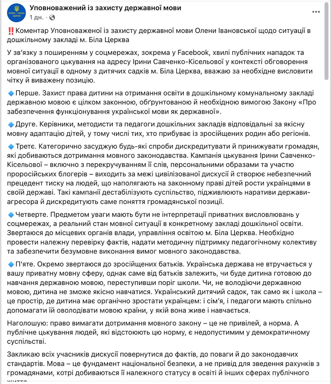 "Категорически осуждаю любые попытки дискредитировать и унижать граждан, добивающихся соблюдения языкового законодательства. Отдельно обращаюсь к русифицированным родителям. Украинский детский сад, так же, как и школа, – это пространство, где ребенок должен органично расти украинцем", - заявила омбудсмен.