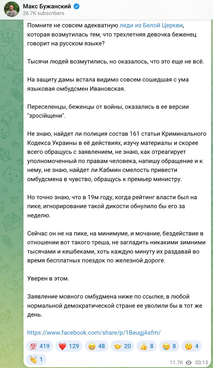 В ответ Ивановскую раскритиковал народный депутат от партии "Слуга народа" Максим Бужанский. Он заявил, что попросит полицию проверить, подпадают ли высказывания омбудсмена под статью 161 УК о нарушении равноправия граждан.