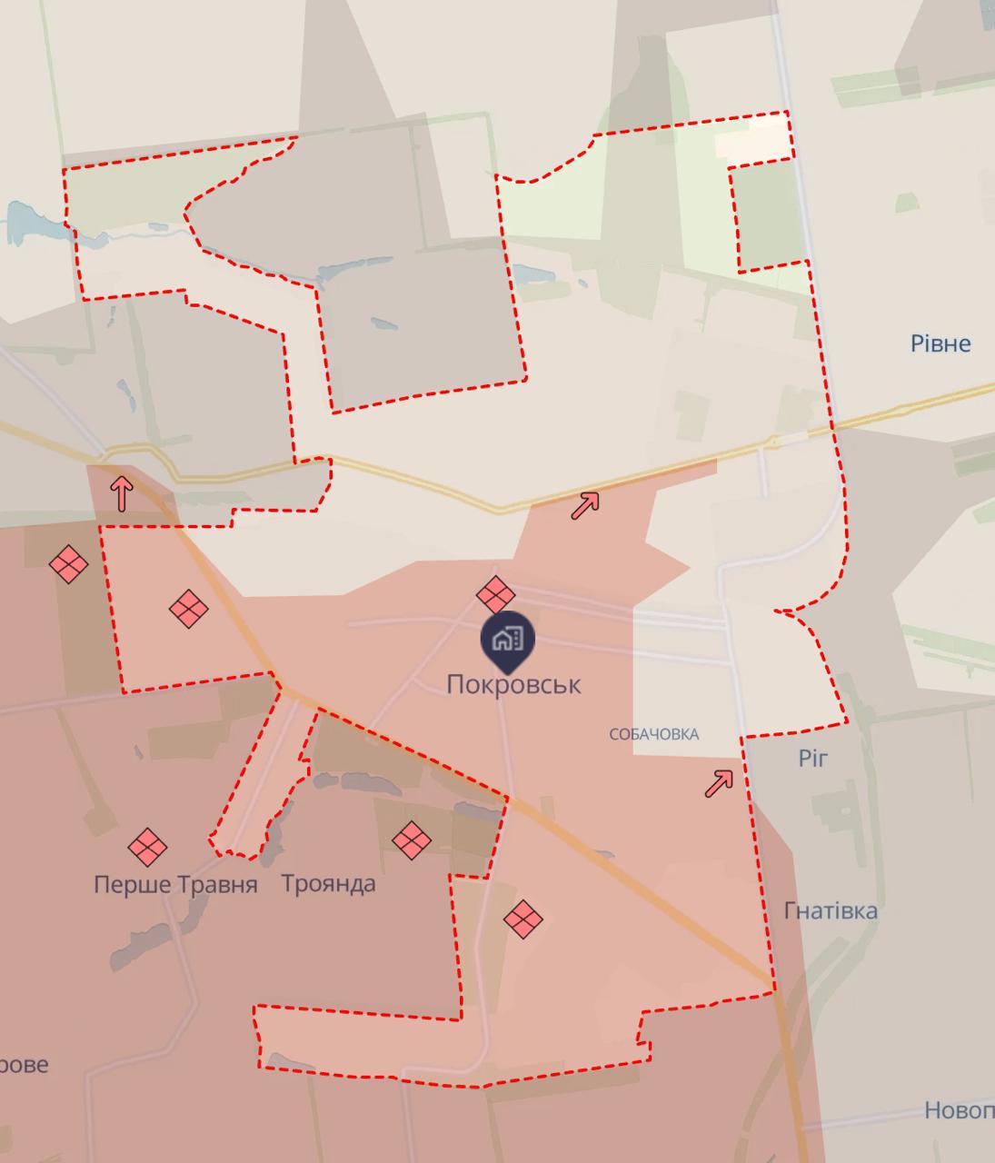 Отметим, что Украина отрицает потерю Покровска, заявляя, что контролирует районы на севере города. На карте Deep State город показан почти полностью под контролем РФ или в серой зоне, но подконтрольные ВСУ участки тоже имеются.