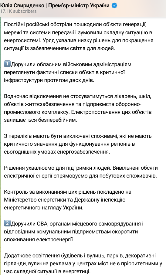 - Исключение части объектов из списков критической инфраструктуры: ОВА должны за два дня обновить перечни и убрать объекты, которые не являются действительно важными. Больницы, школы, объекты жизнеобеспечения и ВПК обещают не отключать.