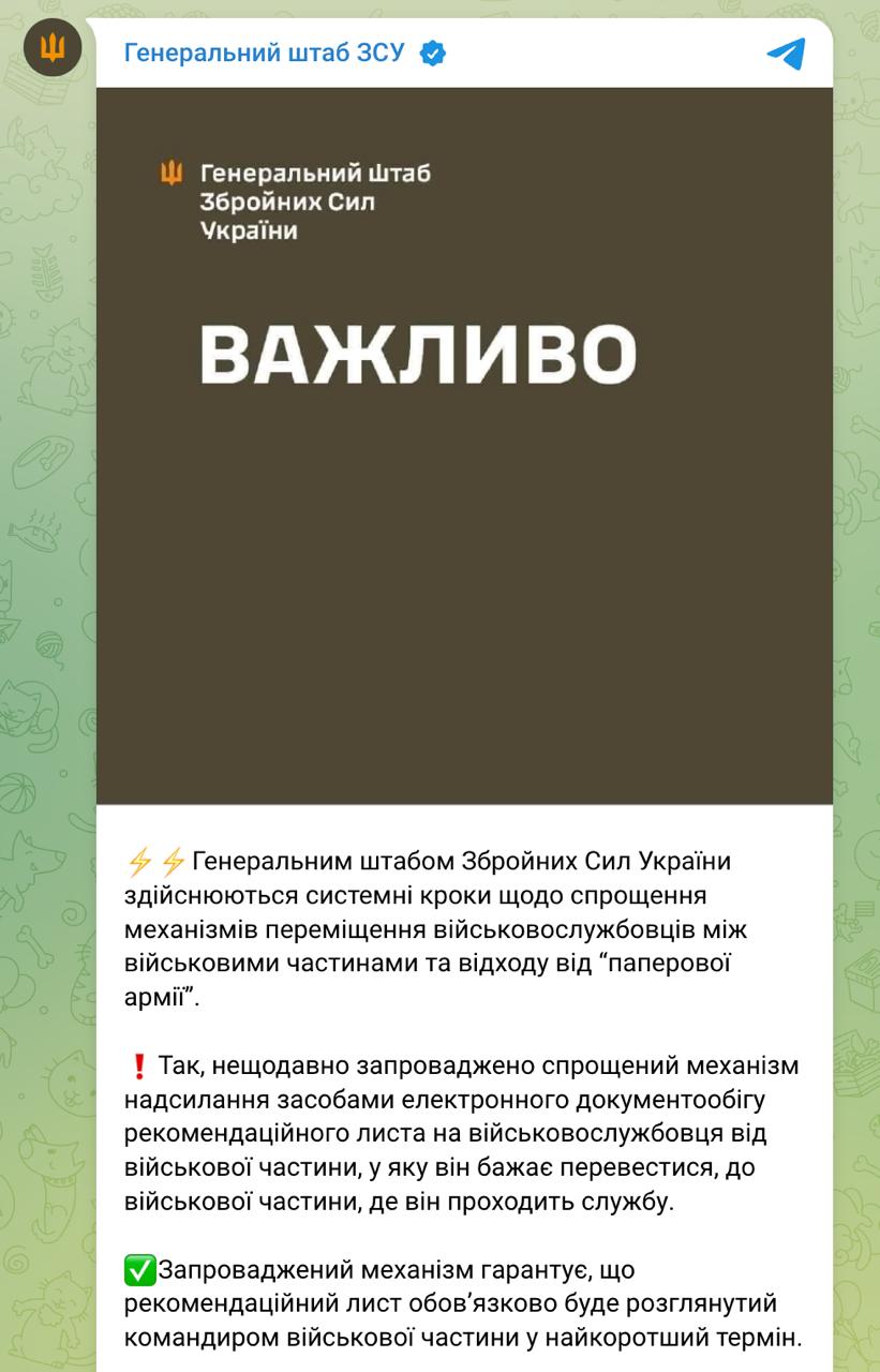 В частности, при назначении военнослужащих, вернувшихся из СЗЧ, на должности в новые воинские части, исключены промежуточные звенья в проработке документов, в частности армейский корпус, оперативное командование и остальные. Документы на назначение подаются напрямую от воинской части в Генштаб.