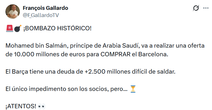 Об этом сообщил журналист El Chiringuito Франсуа Гальярдо на своей странице в социальной сети X.