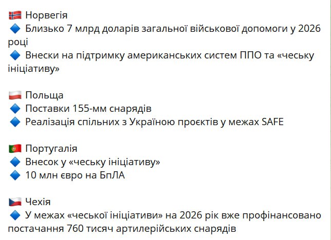 • Норвегия - около 7 млрд долларов общей военной помощи в 2026 году, в том числе взносы в поддержку американских систем ПВО и "чешскую инициативу";