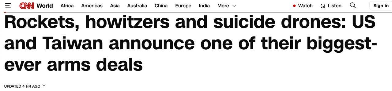 Американское Агентство по сотрудничеству в области безопасности (DSCA) анонсировало, что в пакет помощи войдут реактивные системы залпового огня HIMARS. По данным DSCA, Тайваню поставят системы HIMARS на сумму 4 миллиарда долларов, а также самоходные артиллерийские установки ещё на столько же.