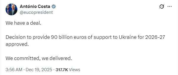 "Мы договорились. Утверждено решение о предоставлении Украине поддержки в размере 90 миллиардов евро на 2026-2027 годы. Мы взяли на себя обязательства, мы их выполнили", – написал он.