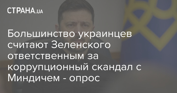 Большинство украинцев считают, что президент Украины Владимир Зеленский должен понести уголовную или политическую ответственность за коррупционные схемы бизнесмена Тимура Миндича.
