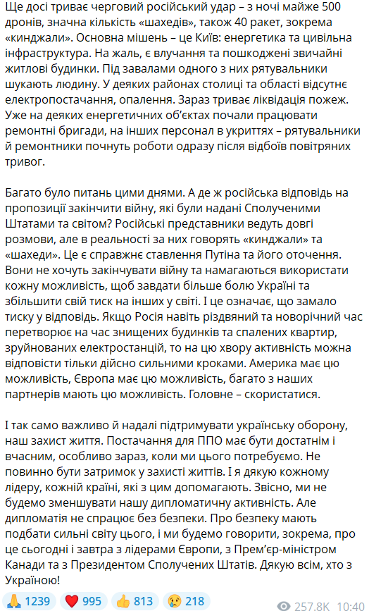 На некоторых энергетических объектах уже начали работать ремонтные бригады, на других персонал находится в укрытиях. Ремонтные и спасательные работы будут продолжены сразу после окончания воздушных тревог, сообщил президент.
