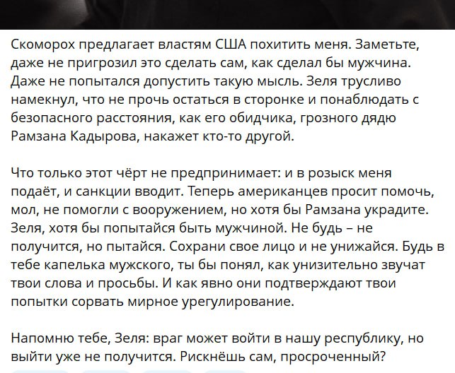 "Теперь американцев просит помочь, мол, не помогли с вооружением, но хотя бы Рамзана украдите… Сохрани свое лицо и не унижайся. Будь в тебе капелька мужского, ты бы понял, как унизительно звучат твои слова и просьбы", – обратился Кадыров к украинскому президенту.
