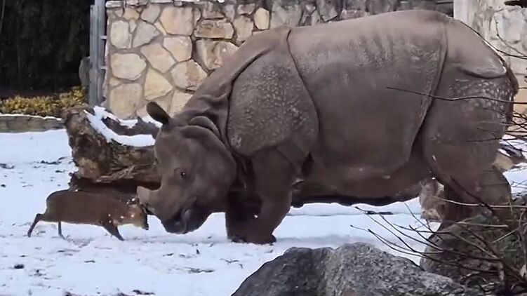 Вроцлавский зоопарк стал ареной поединка карликового оленя и носорога. Кадр из видео