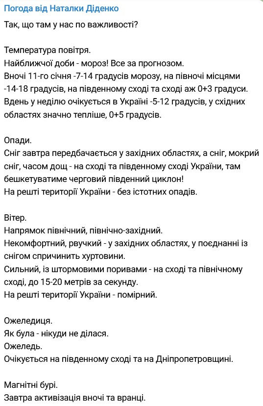 "Ночью 11 января -7…-14 градусов, на севере местами -14…-18 градусов, на юго-востоке и востоке до 0…+3 градусов. Днём в воскресенье в Украине ожидается -5…-12 градусов, в восточных областях значительно теплее - 0…+5 градусов. Завтра снег ожидается в западных областях, а снег, мокрый снег и временами дождь - на востоке и юго-востоке Украины, там будет активничать очередной южный циклон! На остальной территории Украины - без существенных осадков. Направление северное, северо-западное. Неудобный, порывистый - в западных областях, в сочетании со снегом вызовет метели. Сильный, с штормовыми порывами - на востоке и северо-востоке, до 15–20 м/с. На остальной территории Украины - умеренный. Гололёд. Как был - никуда не делся. Ожидается на юго-востоке и в Днепропетровской области. Магнитные бури. Завтра активизация ночью и утром. В Киеве 11 января без снега, с гололёдом и морозом. Ночью -16, при прояснениях до -18 градусов, днём в воскресенье -10…-12 градусов", - пишет синоптик.