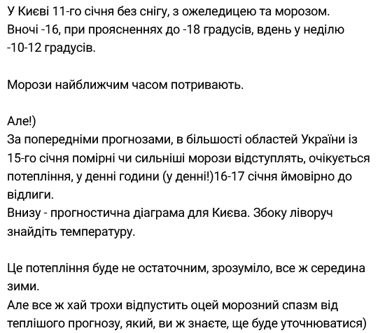 Она добавила, что по предварительным прогнозам в большинстве областей Украины с 15 января морозы умеренной или большей силы отступят, а 16–17 января днём ожидается потепление и возможно оттепель.