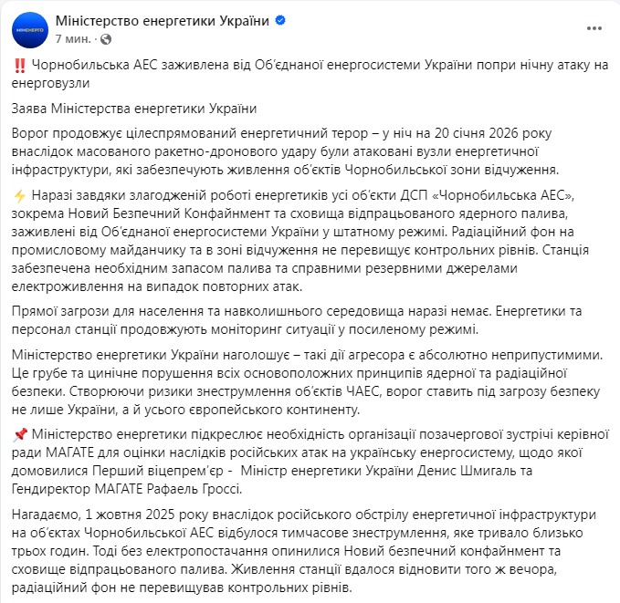 Вскоре после появления публикации МАГАТЭ Министерство энергетики Украины сообщило, что в ночь на 20 января в результате массированного ракетно-дронового удара были атакованы узлы энергетической инфраструктуры, обеспечивающие питание объектов Чернобыльской зоны отчуждения.