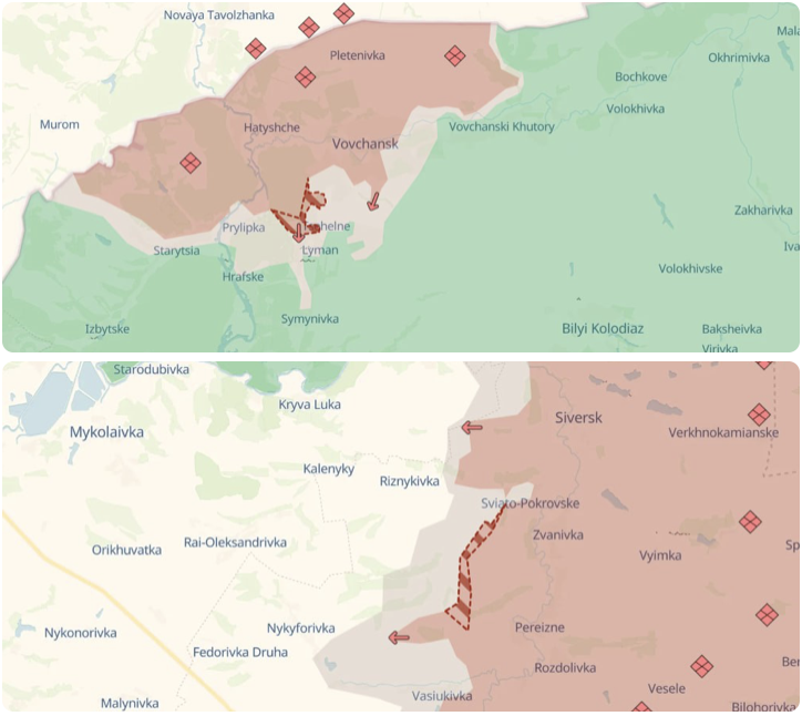 Армия РФ продвинулась возле Синельниково в Харьковской области (близ Волчанска), а также возле Федоровки в Донецкой области (на Славянско-Краматорском направлении), сообщает Deep State.
