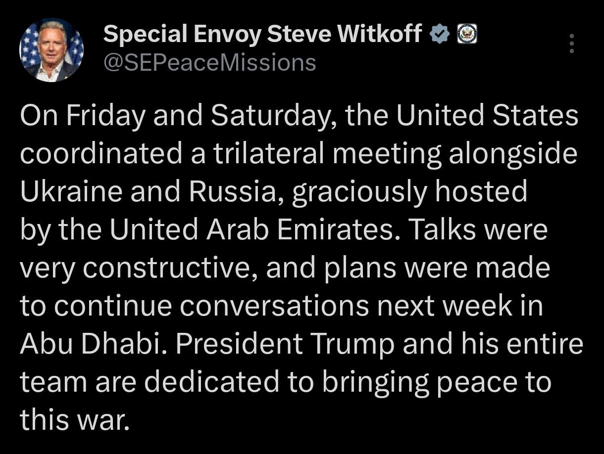 Американские посредники отмечают, что обсуждения проходили без срывов, стороны проявляли взаимное уважение при поиске решений. По оценке источников, итоги переговоров оказались "максимально позитивными на данном этапе", а встреча в Абу-Даби расценивается как важный шаг к следующей фазе диалога о мире.