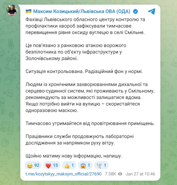В новом посте Козицкий сообщил, что специалисты Львовского областного центра контроля и профилактики болезней зафиксировали временное превышение уровня оксида углерода в селе Смольное. Это связано с утренней атакой беспилотника по объекту инфраструктуры в Золочевском районе.