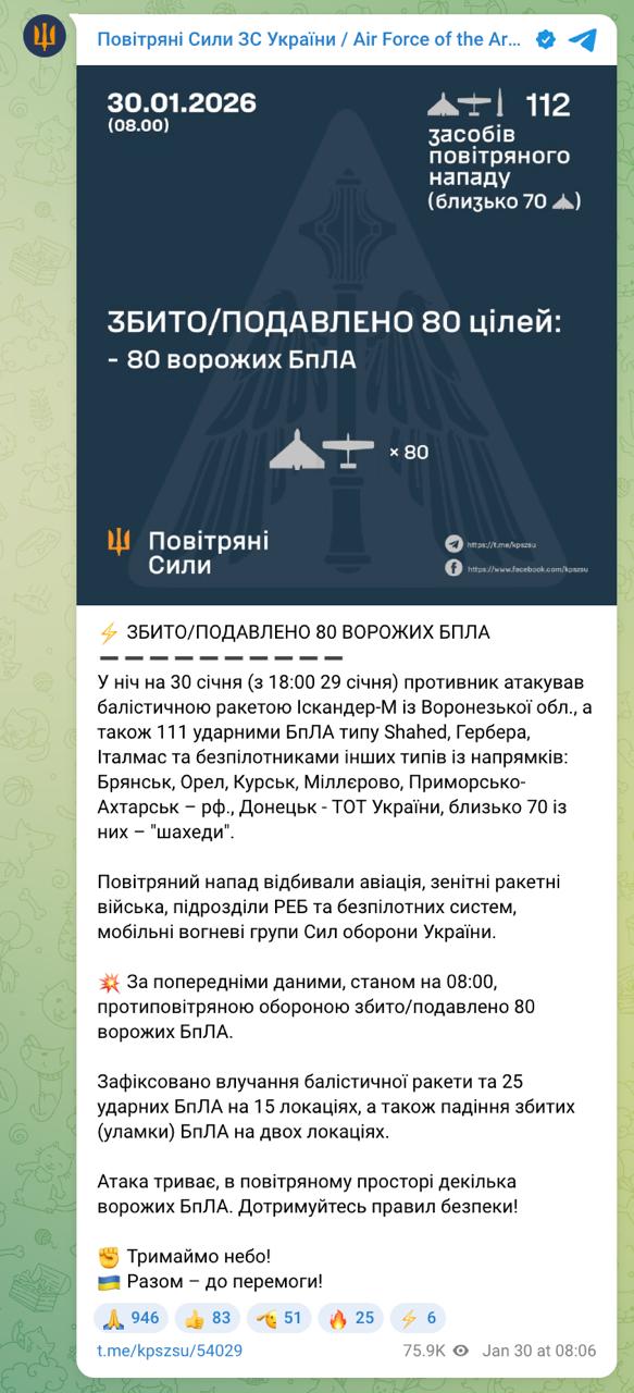 08:05 В первую ночь энергетического перемирия войска РФ атаковали Украину с помощью баллистической ракеты "Искандер-М" и 111 беспилотников, сообщают в Воздушных силах. ПВО сбила или подавила 80 дронов.