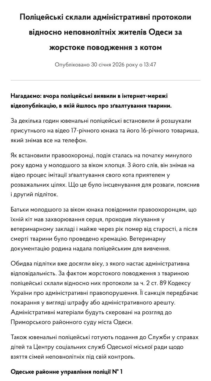 Полицейские составили в отношении юношей протоколы по факту жестокого обращения с животным (по ч. 2 ст. 89 Кодекса Украины об административных правонарушениях). Также ювенальные полицейские готовят представление в Службу по делам детей и Центр социальных служб Одесского городского совета относительно взятия семей несовершеннолетних под свой контроль.