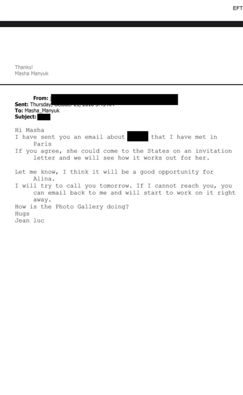 В сети публикуют сообщение женщины, которая называет себя бывшей моделью и утверждает, что Манюк отправляла девушек к Эпштейну для оказания секс-услуг. В качестве доказательства она опубликовала собственное фото, которое, по ее словам, содержится в файлах Эпштейна, а также скриншоты переписки. Она заявляет, что именно Манюк занималась отбором и направлением моделей из Украины.