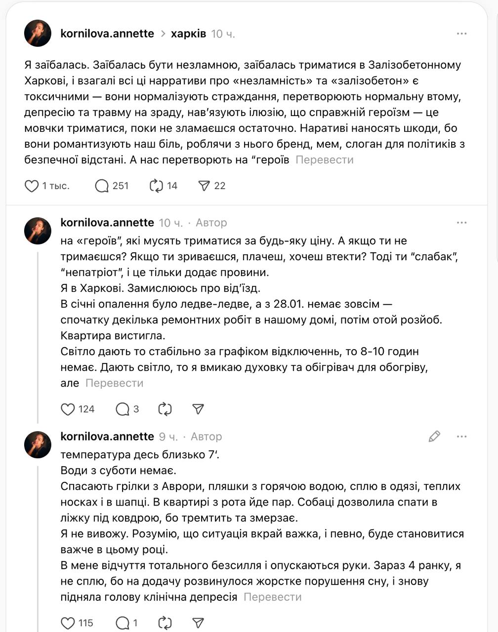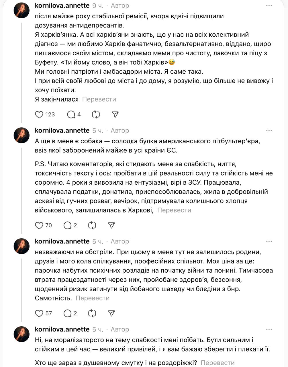 "Я зае@алась быть несокрушимой, держаться в железобетонном Харькове. И вообще все эти нарративы о "несокрушимости" и "железобетоне" токсичны: они нормализуют страдания, превращают нормальную усталость, депрессию и травму в предательство, навязывают иллюзию, что настоящий героизм - это молча держаться, пока не сломаешься окончательно. Нарративы наносят вред, потому что они романтизируют нашу боль, делая из нее бренд, мем, слоган для политиков с безопасного расстояния. А нас превращают в "героев", которые должны держаться любой ценой. А если ты не держишься? Если ты срываешься, плачешь, хочешь сбежать? Тогда ты "слабак", "не патриот", и это только добавляет вины", - написала Корнилова.
