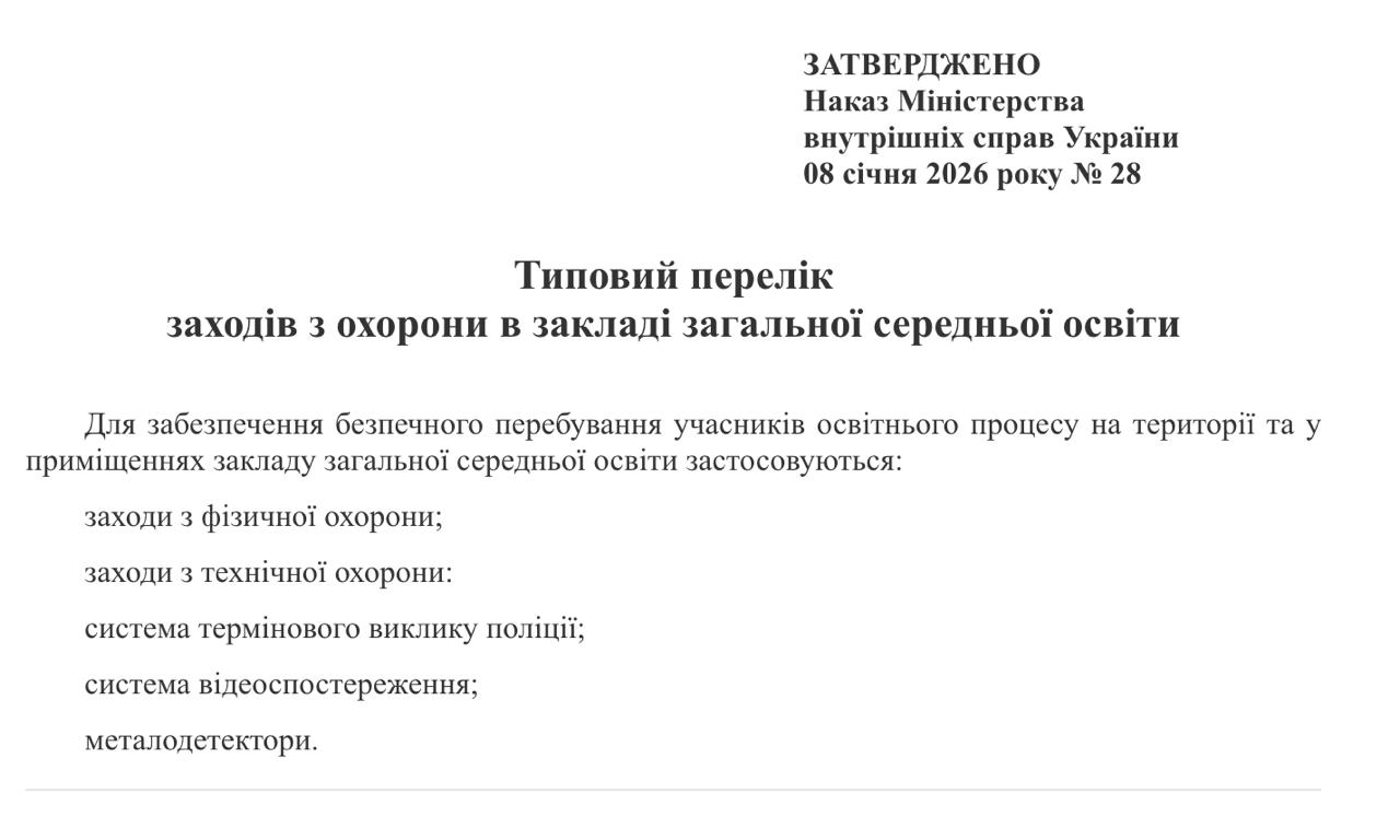 Министерство внутренних дел обновило список мер по охране учебных заведений на период военного положения. Согласно документу, теперь во всех школах должны быть установлены металлодетекторы, системы видеонаблюдения и срочного вызова полиции, а также присутствовать охрана.