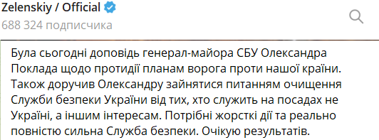 "Сегодня состоялся доклад генерал-майора СБУ Александра Поклада о противодействии планам врага против нашей страны. Я также поручил Александру заняться вопросом очищения Службы безопасности Украины от тех, кто служит не Украине, а другим интересам. Нужны решительные действия и действительно полностью сильная Служба безопасности. Ожидаю результатов", - заявил Зеленский.