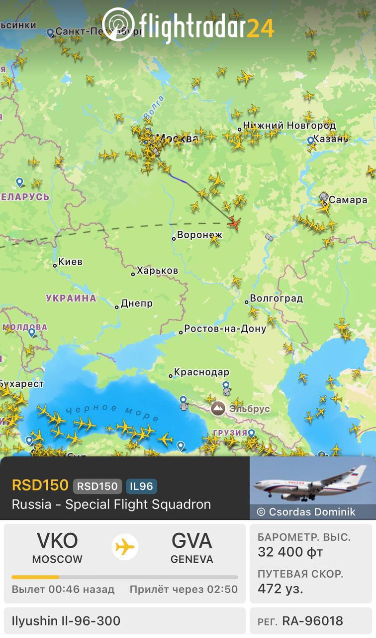 Между тем, судя по данным сервиса Flightradar, самолёт с российской делегацией, который вылетел из Москвы в Женеву, полетит не по самому короткому маршруту через Польшу и Германию, а облетит Европу с юга.