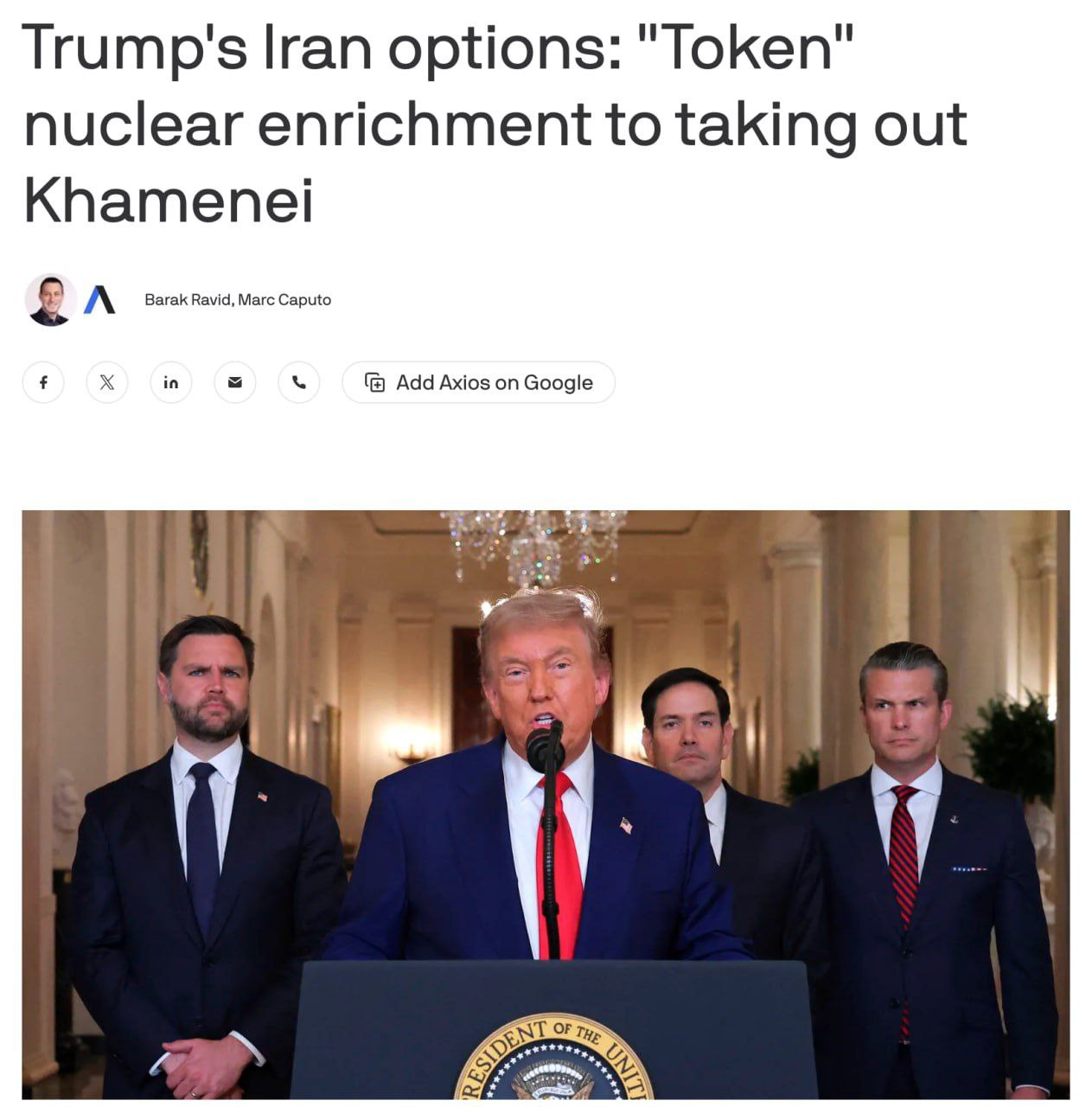 Публичные позиции сторон по обогащению урана остаются далекими. По мнению источников, спецпредставитель Стив Уиткофф и Джаред Кушнер донесли до главы МИД Ирана Аббас Арагчи позицию о нулевом обогащении на территории Ирана.