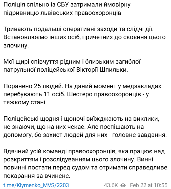 "Продолжаются дальнейшие оперативные мероприятия и следственные действия. Устанавливаем других лиц, причастных к совершению этого преступления", - пишет Клименко.