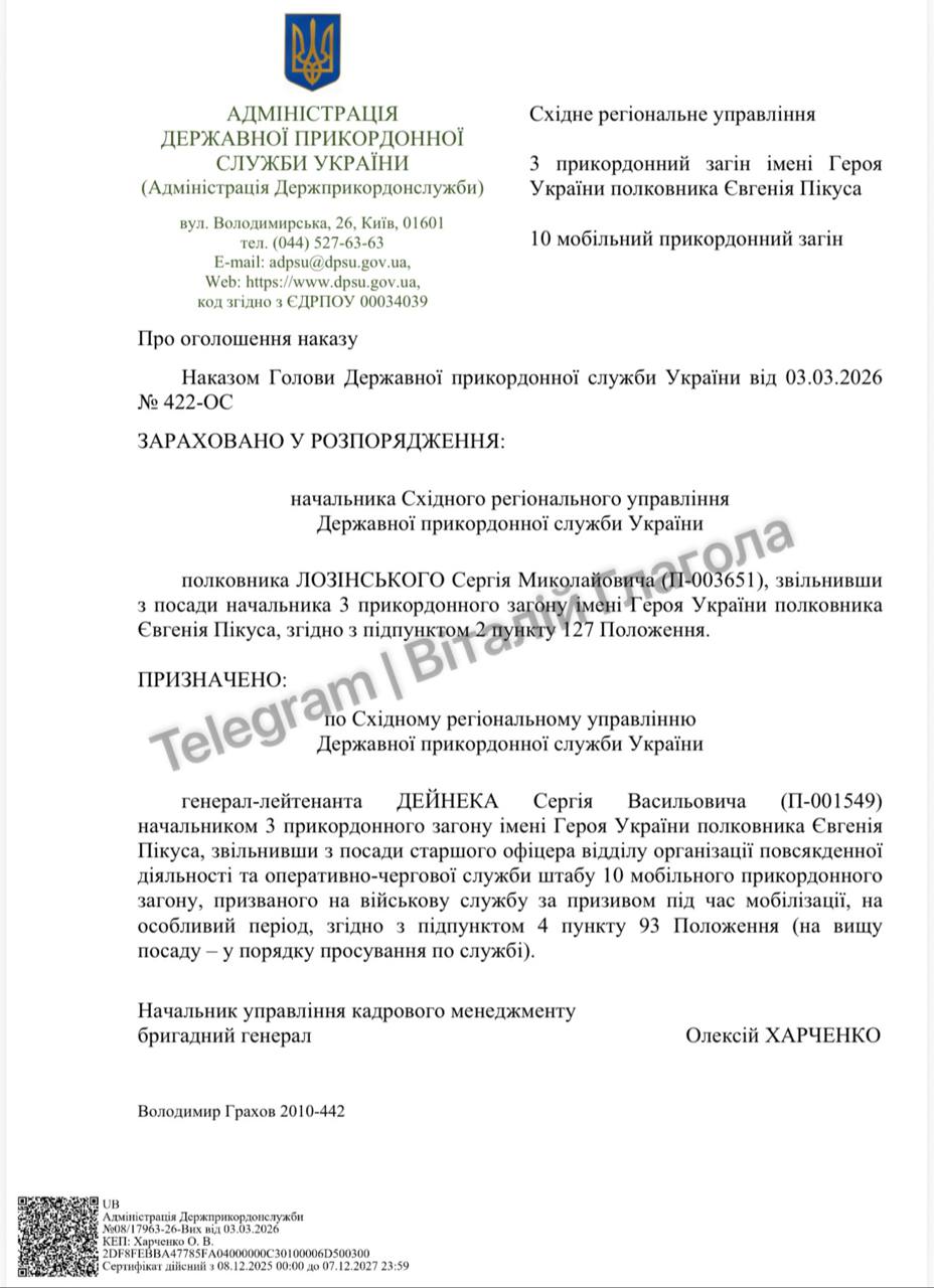 Напомним, в январе Сергей Дейнеко был уволен с должности главы Госпогранслужбы Украины. На данный момент он является фигурантом уголовного производства по вероятному получению взяток при содействии контрабанде сигарет в 2023 году.