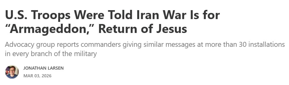 По его информации, командир одного из боевых подразделений армии США заявил младшим офицерам, что война с Ираном является частью божьего плана, и что президент Дональд Трамп был "помазан Иисусом, чтобы зажечь сигнальный огонь в Иране, который вызовет Армагеддон и ознаменует его возвращение на Землю".