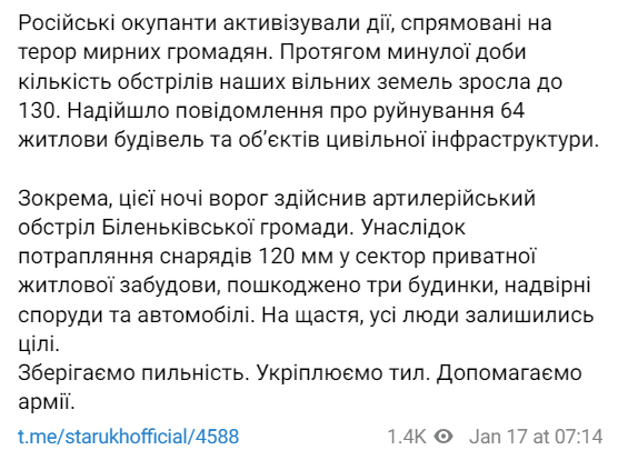За його словами, вночі росіяни вдарили з артилерії по Біленьківській громаді. Внаслідок влучення снарядів 120-мм по приватному сектору пошкоджено три будинки, дворові споруди та автомобілі. На щастя, люди не постраждали.