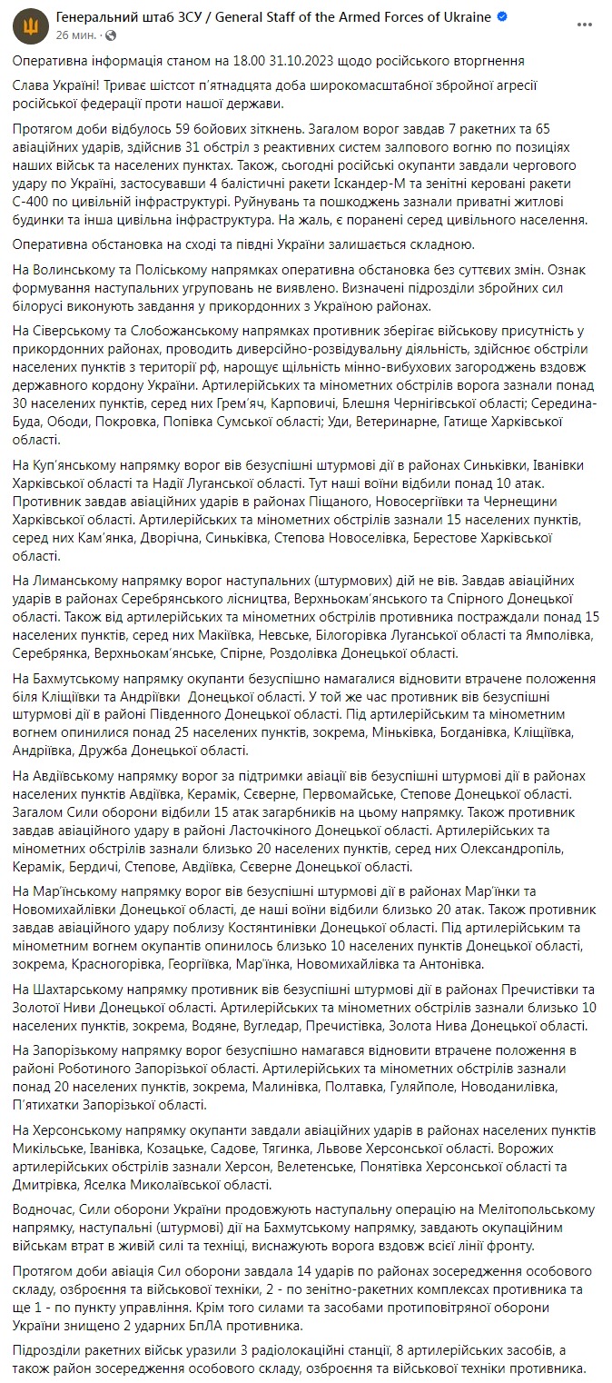 Генштаб ЗСУ опублікував оперативну інформацію щодо ситуації на фронтах станом на 18:00 31 жовтня.