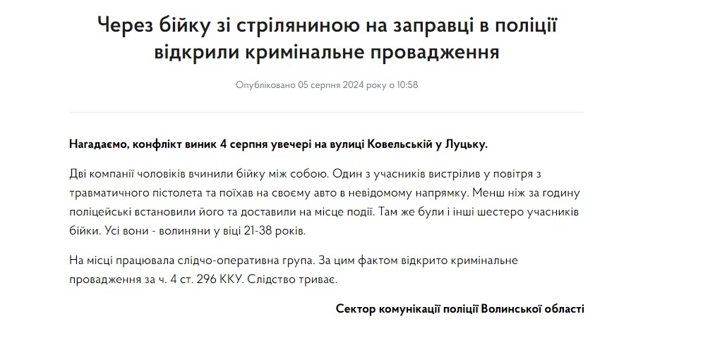 "За цим фактом порушено кримінальні провадження за ч. 1 ст. 295 та ч. 1 ст. 293 Кримінального кодексу України. Правоохоронці продовжують встановлювати учасників інциденту, опитувати очевидців та з'ясовувати інші деталі події. Слідчі дії продовжуються", - сказано в повідомленні.