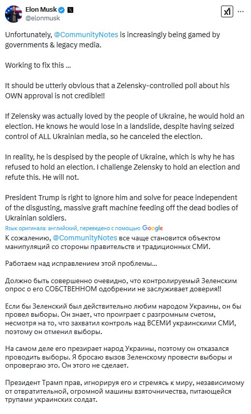 "Президент Трамп правий, ігноруючи його (Зеленського - Ред. ) і прагнучи світу, незалежного від огидної, величезної машини хабарництва, що харчується трупами українських солдатів", - заявив Маск.