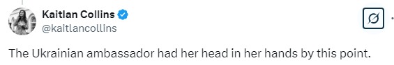 "Те, що почалося з питань про гарантії безпеки при припиненні вогню з Україною, перетворилося на гнівну суперечку між Трампом, Венсом і Зеленським. Трамп лютував і закінчив словами: "Ми дали вам можливість бути крутим хлопцем... Або ви укладаєте угоду, або ми виходимо. У вас немає карток". Український посол схопилася за голову в цей момент", - написала Коллінз.
