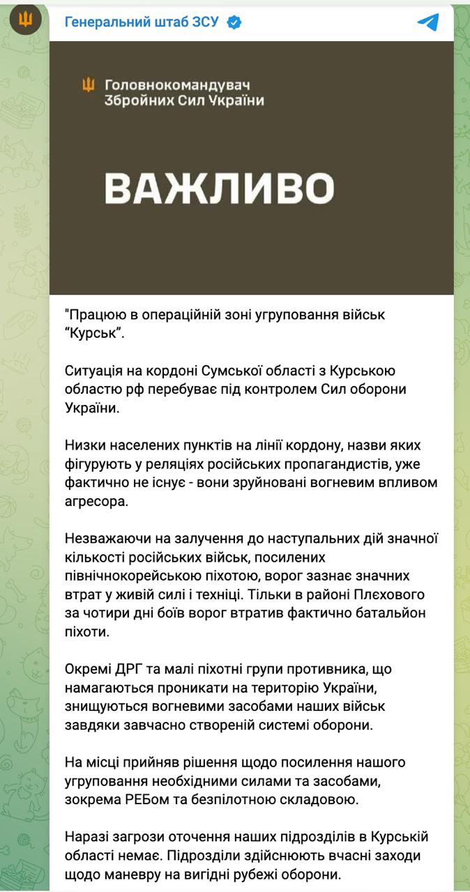 При цьому він запевнив, що загрози оточення ЗСУ у Курській області немає, а "ситуація на кордоні Сумської області з Курською областю РФ знаходиться під контролем Сил оборони України".